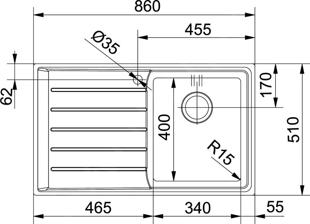 - agujero para el grifo de 35 mm de diámetro